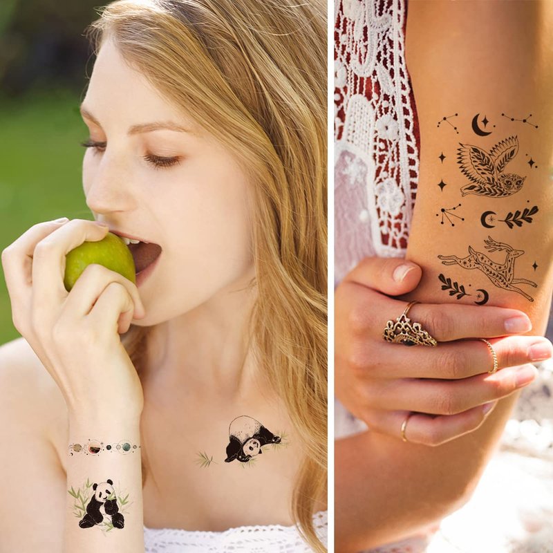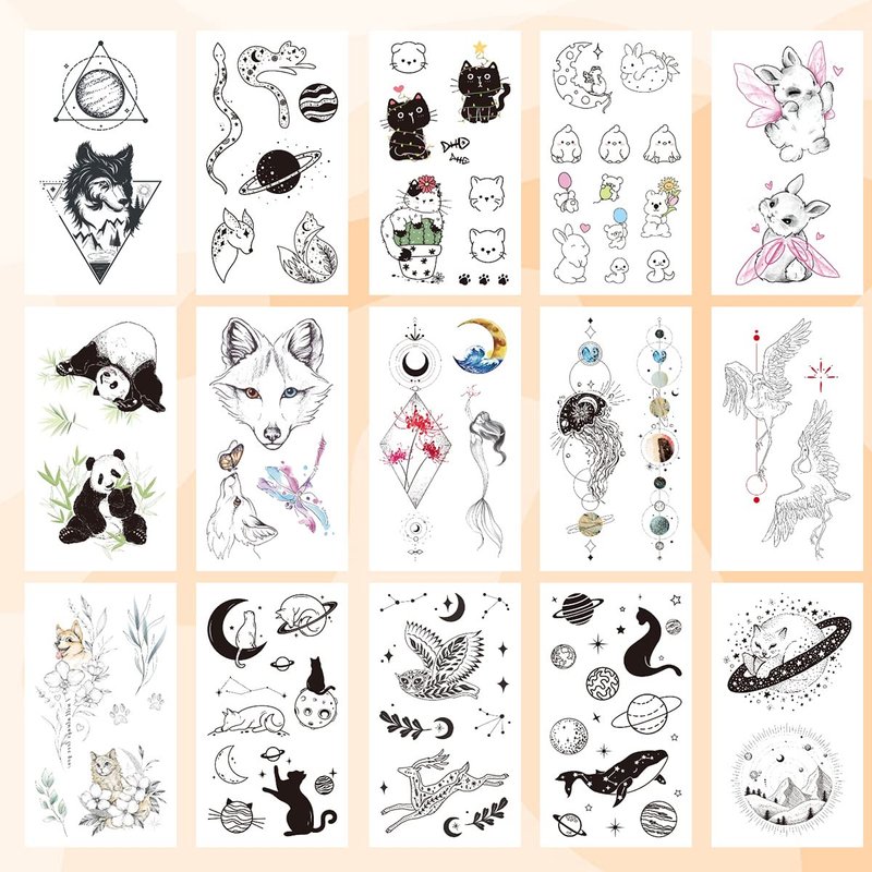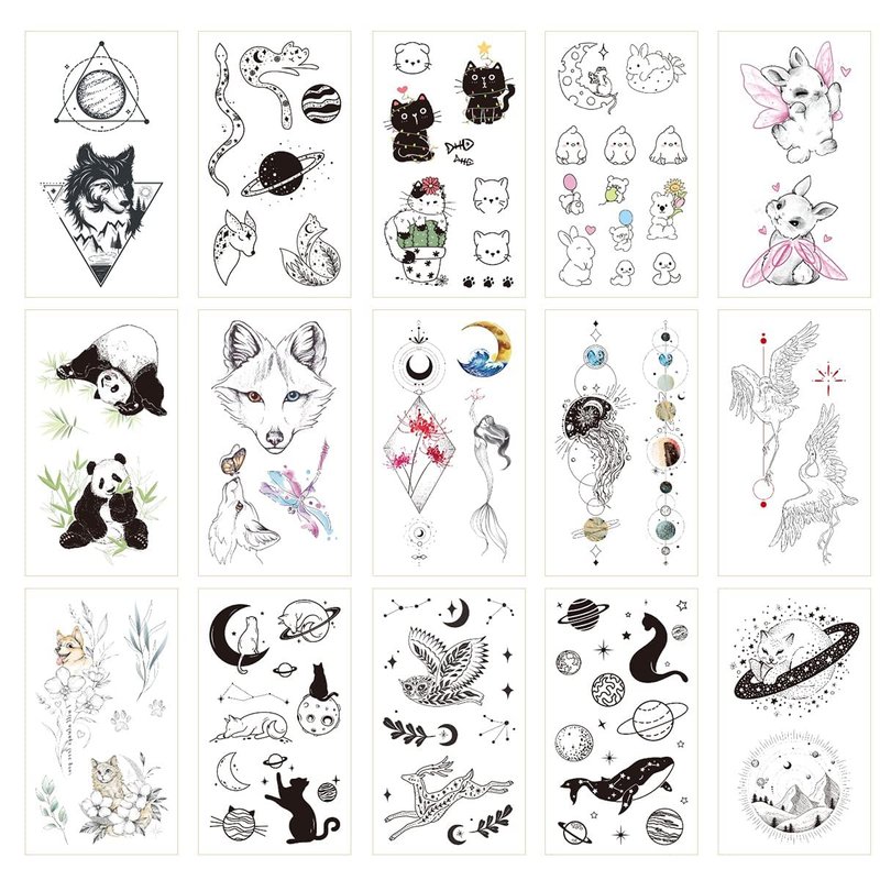 - Stylish & Realistic - 15 individual pack small space and animal temporary tattoo set with vivid details, 2.36"x4.13"/sheet, featuring as moon, stars, planets, galaxy, wolf, cat, rabbit, whale, snake styles etc. They look so real and cute in a distance, show your personalities with these body tattoos!