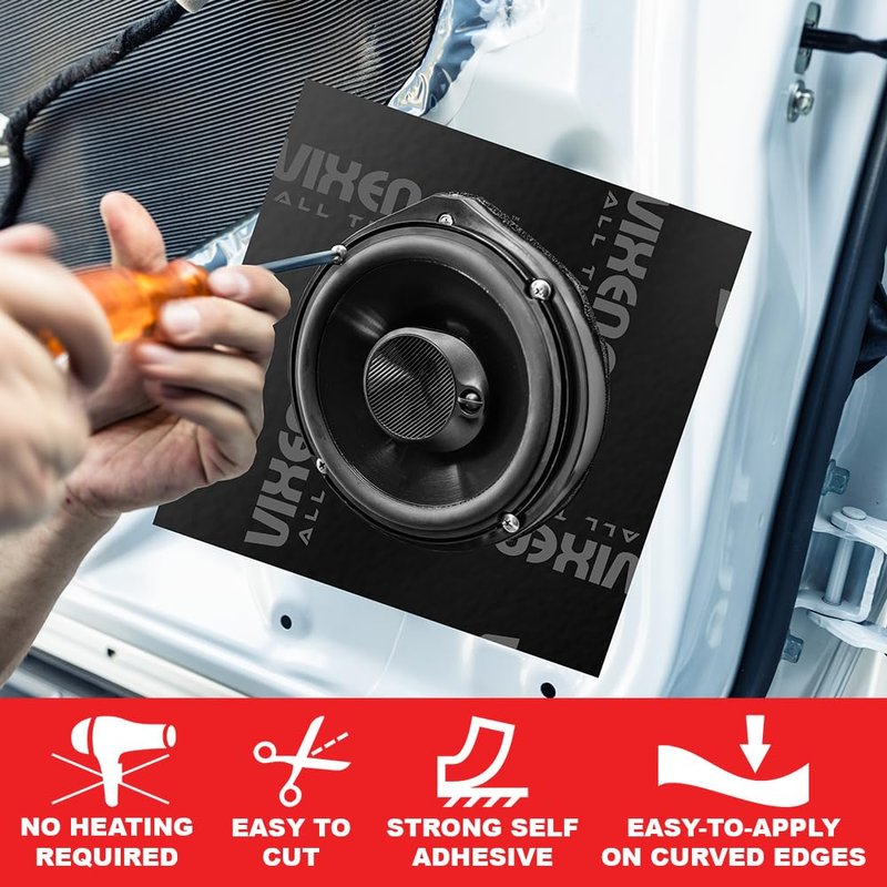 This sound deadening kit was designed specifically for mounting speakers in a contoured metal surface such as car doors or rear deck, the sound dampening material will transform your car's flimsy sheet metal into a solid, non-resonant baffle. Made of a self-adhesive light-weight butyl rubber and aluminum constrained-layer, it is well suited to the most demanding car sound enthusiasts that want to get the sound quality from their speakers they have always wanted and keeping to the minimum the noise from the road, vibrations and distortion for a more comfortable driving experience. Sound Deadening Material Contents: 25x25cm (Approx. 10"x10") 2 Sheets 1/16" Material Thickness Total Coverage Area: 1.34 sq. ft Black Aluminum with Self-adhesive Butyl Rubber Backing Reduces Road Noise and Rattles Improve Sound Quality by Blocking Resonance, Vibrations and Reducing Distortion Perfect for High SPL Environments Thermal Shield Aluminum Layer for High-temperature Areas Easy to Cut and No Heat is Required for the Installation Ideal for Speaker Panels