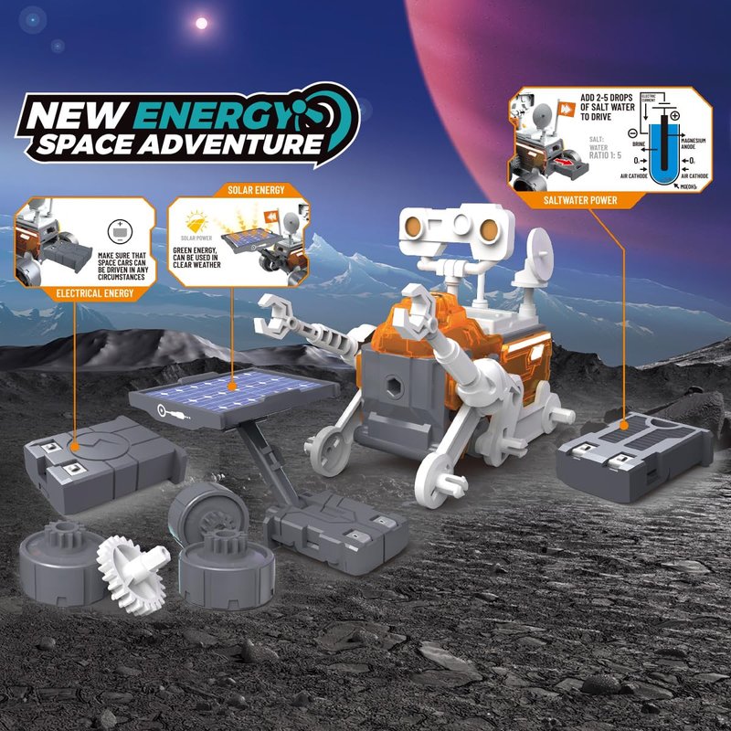 Introducing the SPACE EXPLORATION ROVER TOY WITH 3 POWER MODULES, a revolutionary toy that sparks the imagination of young explorers. This rover is not just any toy; it's a STEM-inspired marvel designed for kids aged 8 YEARS OLD and OVER. SUITABLE FOR ASSEMBLY ROBOTS OVER 8 YEARS OLD, this toy offers a hands-on learning experience that blends fun with education. The rover comes WITH SOLAR, SALT WATER POWER AND BATTERY POWER MODES, providing multiple ways to power your rover. Whether you harness the power of the sun with the SOLAR MODULE, or experiment with SALT WATER POWER, this toy is perfect for curious minds. The BATTERY POWER MODE ensures that your rover is always ready for action, even when the sun isn't shining. This SPACE EXPLORATION ROVER TOY is more than just a toy; it's a gateway to understanding different energy sources and their applications. Suitable for ASSEMBLY ROBOTS, this toy encourages creativity and problem-solving skills. With its unique POWER MODES, it's an ideal gift for any child interested in science and technology. Ignite the spirit of EXPLORATION with this innovative TOY that combines education and entertainment in one exciting package.