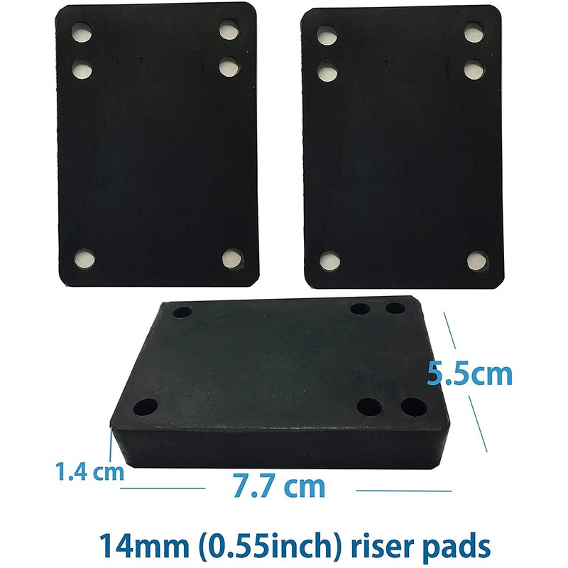 - VARIETY SKATEBOARD RISER PADS OPTIONS: We have many options, such as standard shock pads 3mm, 6mm, 12mm, 14mm and angle wedge riser pads.