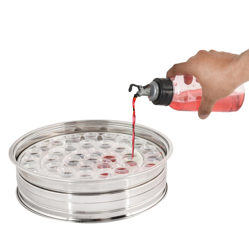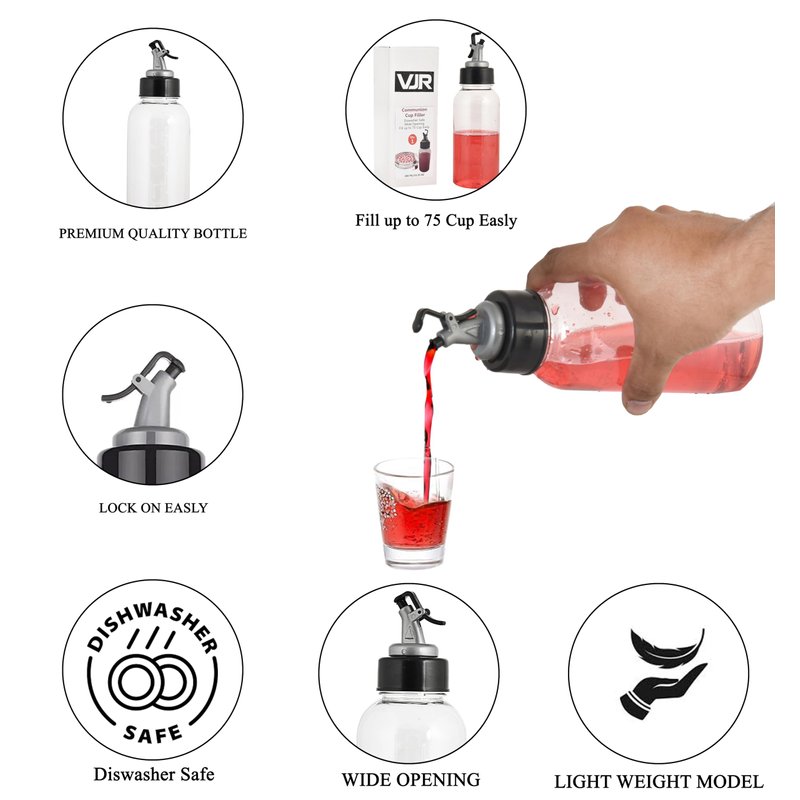 The VJR Communion Cup Filler is a practical and efficient tool designed for churches and religious gatherings. Made from durable hard plastic, this lightweight bottle ensures easy handling and precise pouring, reducing spills and waste.