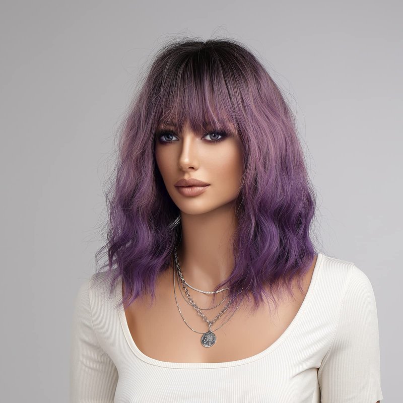 VKheroKV WS-02 Women's Wavy Wig With Hair Bang Shoulder Length Bob Wigs Synthetic Heat Resistant Natural Curly Wigs For Party Daily Cosplay (Ombre Purple)