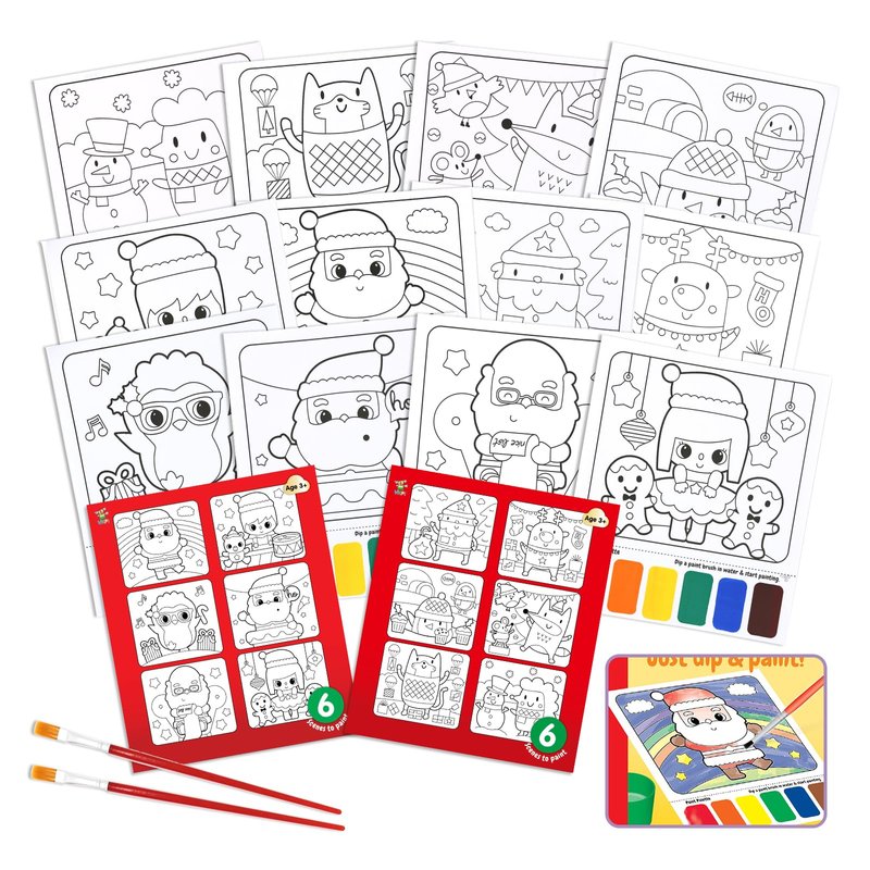 - Christmas Watercolor Books: Package includes 2 water coloring Xmas activity books. Each book has 6 painting sheets, totally 12 sheets to draw. There are 6 color squares in each page. Multi-styles patterns to paint like animals, princess, fairy, pirates and so on.