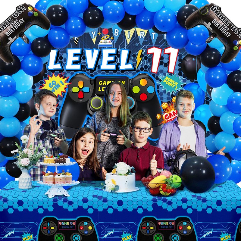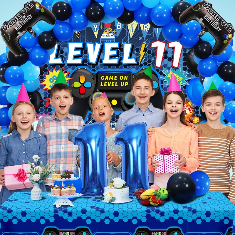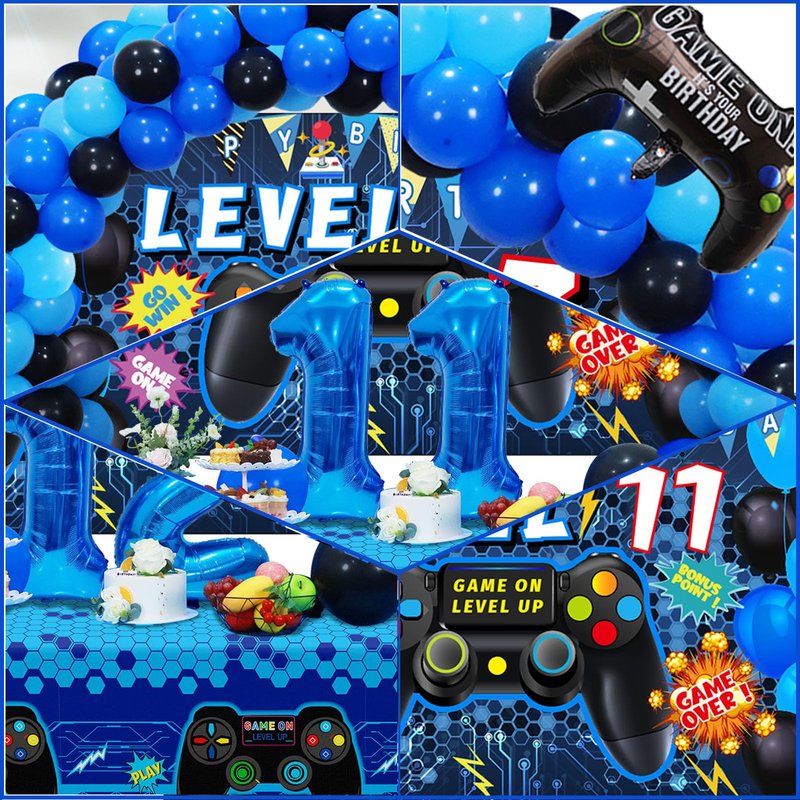 - [Package Included]-The set includes blue '11' foil balloons x1, 11th video game birthday backdrop x1, foil gamer balloons x2, blue tablecloth x1, 85pcs latex balloon, in addition, 1 roll of balloon dot glue, 1 roll of balloon ribbon, 1 roll of double hole balloon chain, 1 roll of banner rope.