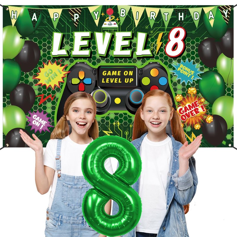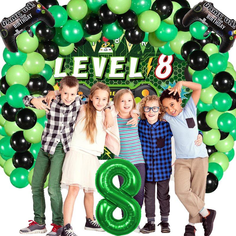 - Package Included: The set includes green '8' foil balloons x1, 8th video game birthday backdrop x1, foil gamer balloons x2, green tablecloth x1, 85pcs latex balloon, in addition, 1 roll of balloon dot glue, 1 roll of balloon ribbon, 1 roll of double hole balloon chain, 1 roll of banner rope.