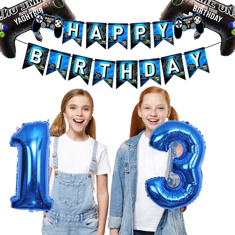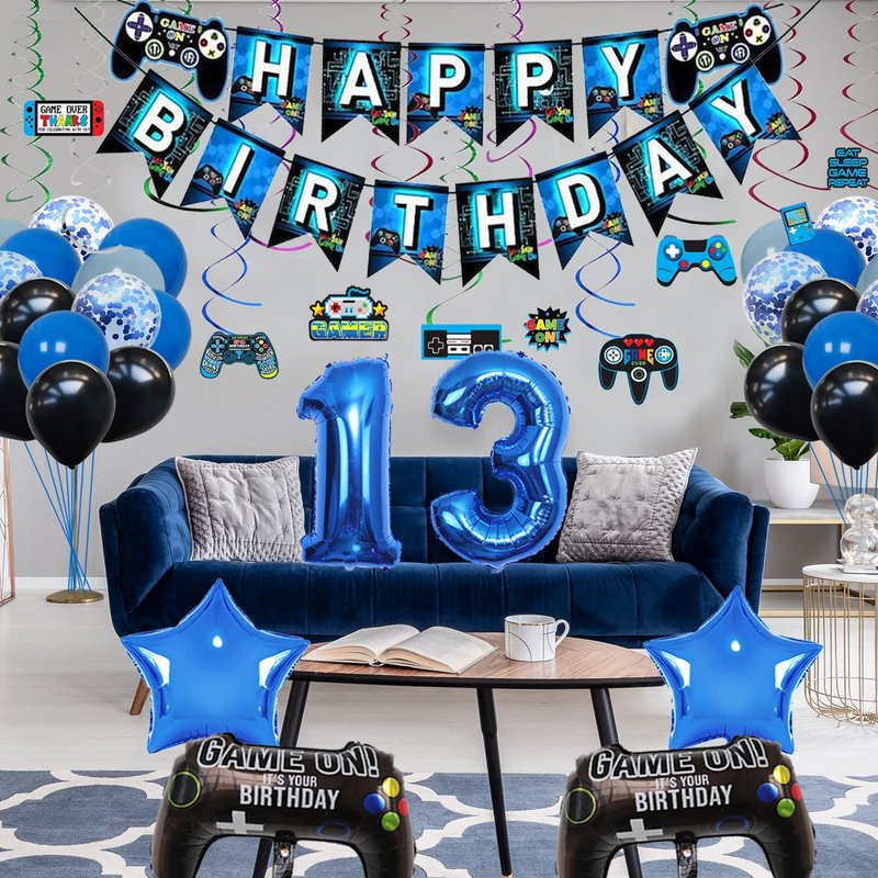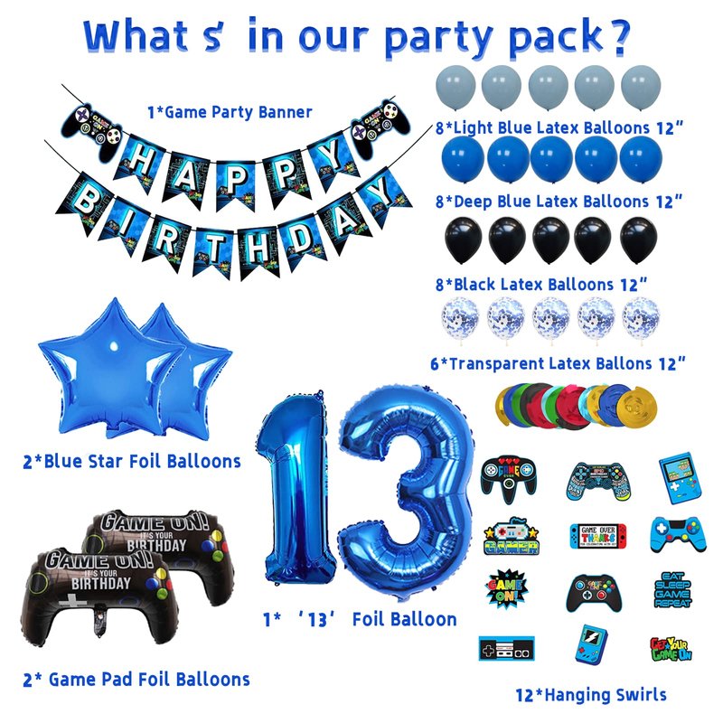 - [Package includes]- 1 happy birthday banner, 1 set of number 13 foil balloon, 2 game pad foil balloons, 2 star foil balloons, 30 latex balloons and 12 hanging swirls.
