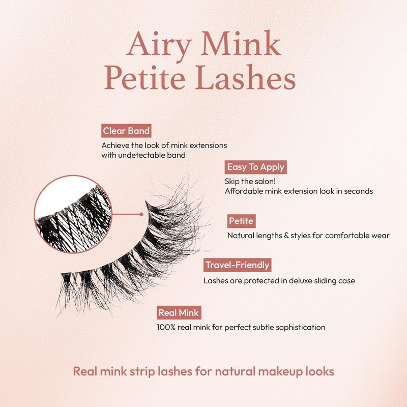 Embrace the essence of natural beauty and subtle sophistication with VLuxe Airy Mink Lashes, designed specifically for those who seek refinement and elegance in their everyday look. These premium lashes are meticulously crafted from 100% real mink, ensuring an authentic, luxurious experience that enhances your natural beauty without appearing overdone. The VLuxe Airy Mink collection offers a variety of petite styles, tailored to complement different eye shapes and preferences, ensuring that every wearer can find their perfect match. Each lash is attached to a superfine clear band, which not only makes the lashes look more natural by blending seamlessly with your lash line but also provides unparalleled comfort throughout the day. This innovative band design eliminates the common discomfort associated with wearing false lashes, allowing you to enjoy the feeling of lightness and a 'barely-there' look. Ideal for daily wear, these lashes provide a boost of confidence with their subtle sophistication and elegance. Whether you're at work, enjoying a casual day out, or attending a special event, VLuxe Airy Mink Lashes enhance your eyes with just the right amount of flair. They are also incredibly easy to apply and remove, saving you time and effort in your beauty routine. Invest in VLuxe Airy Mink Lashes and experience the perfect blend of style, comfort, and luxury. Make them a staple in your beauty arsenal and enjoy the look of natural, sophisticated lashes every day.