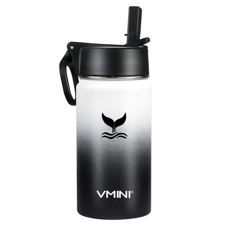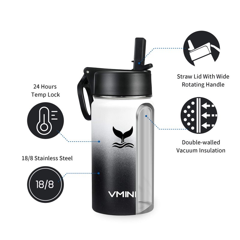 Vmini Kids Water Bottle - Insulated Water Bottle with Straw, Wide Mouth Stainless Steel & Vacuum, New Straw Lid with Wide Handle, Gradient White+Black & 12 oz