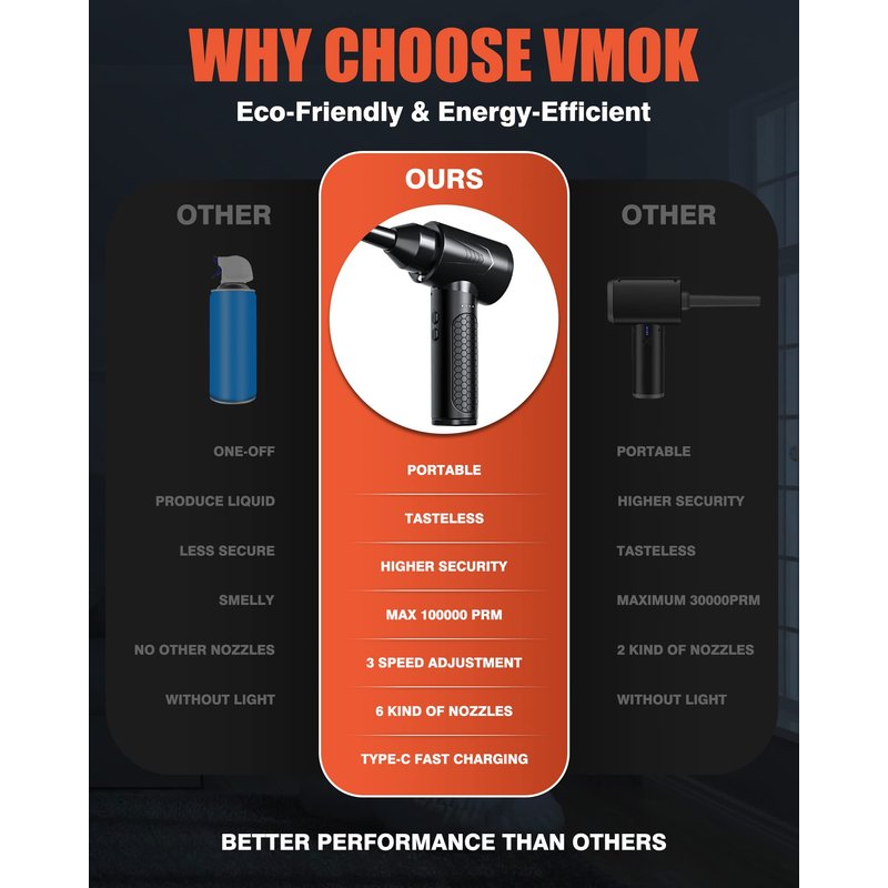 - Eco-Friendly & Energy-Efficient: Alternative to canned air VMOK Compressed Air can be recharged and used repeatedly. It is more energy-efficient and environmentally than constantly buying canned air, save money, cordless air dusters electric is a onetime investment, you can have a permanent air duster electric.It's the perfect choice for home, office, and car dust cleaning.