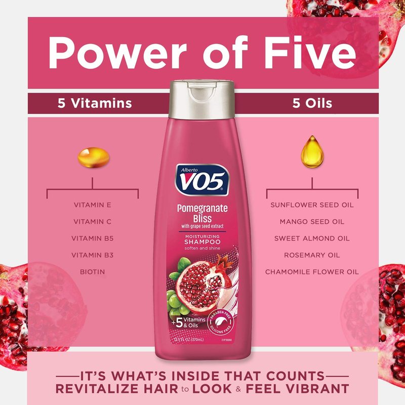 - POMEGRANATE BLISS MOISTURIZING SHAMPOO: Alberto VO5's unique formula blended with the Power of 5 vitamins and 5 oils provides beautiful soft, shiny hair. That’s the secret of VO5. 12.5 oz. Bottle