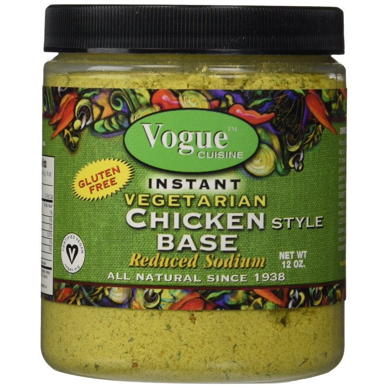 Vegetarian Chicken Base: A vegetable* blend of ORGANIC NON-GMO soy flour*, ORGANIC NON-GMO soy grits*, ORGANIC potato flour*, natural Maltodextrin, nutritional yeast extract, ORGANIC sucanat/sugar*, ORGANIC alfalfa powder*, ORGANIC minced carrots, pea powder**, parsley**, spinach**, soy oil, salt/sea salt, lecithin (from plant), grounded celery seeds, garlic powder, rosemary extract and white pepper. // - Certified vegetarian/vegan. * ORGANIC ingredients from domestic (USA) organic suppliers. ** Ingredients that may or may not be ORGANIC, depending on availability of supply at manufacturing.// DIRECTIONS: 1) Quick and Easy: Soup and Seasoning. For extra flavor, use any Vogue Base in your favorite soup recipe calling for stock. 2) Stock - 1 tablespoon to one cup boiling water. Substitute 1 cup of any Vogue broth for liquid called for in your soup or stew recipe. 3) Sprinkle on Grains, pasta, broiled, steamed or sautéed veggies potatoes, carrots, broccoli, string beans,cauliflower. Also great on chicken, fish and tofu. 4) Use as salt substitute - Sprinkle according to taste. 5) For Sauces & Gravy - Use Vogue VegeBase as a sauce by adding 3 tablespoons of any soup base to 1 cup hot water. Simmer and reduce until thickened. Add 2 tablespoons of any flavor (chicken , beef , onion or veggie chicken) to 1 cup water, stir and simmer till thickened ( Aprox 10 min). 6) For grains - Add 1 heaping tablespoon to 2 or 3 cups of boiling water. 7) VOGUE POPCORNS - Sprinkle on popped popcorn using any flavor to taste! And many more ways to use Vogue bases...