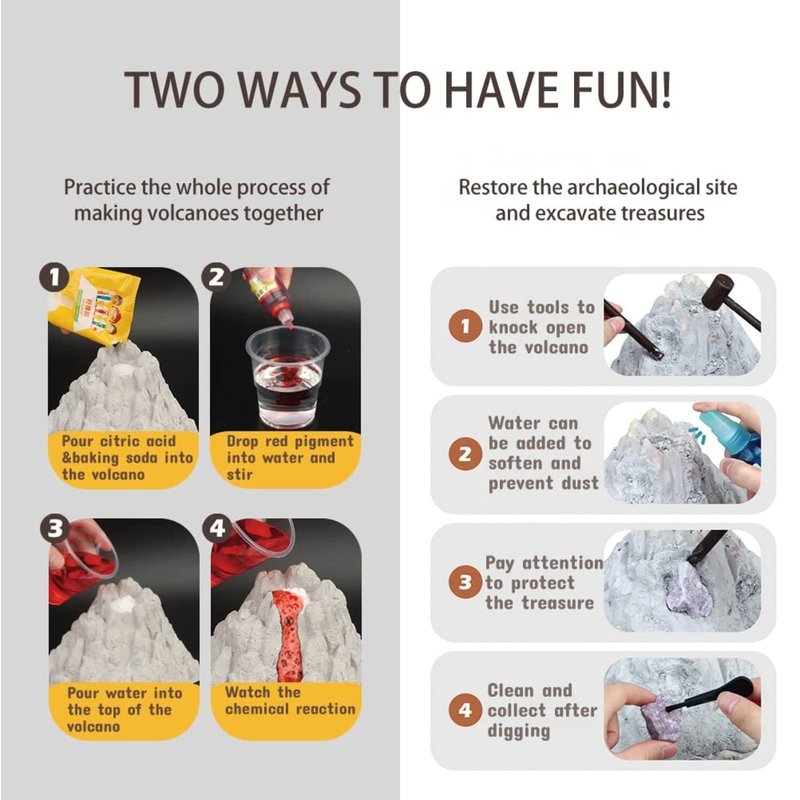 - A science kit that inspires exploration - Your children will explore the mysteries of volcanic eruptions and the joy of archaeological digging. Through this experience, your children will ignite their desire to explore science. The science kit will include volcanic eruption and treasure/dinosaur fossil excavation sets, providing a double surprise.
