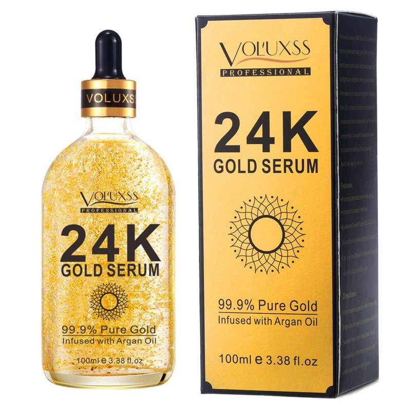 Voluxss Luxury 24K Gold Facial Serum formulated with real pure 24K gold foil and pure hyaluronic acid and argan oil to fight and improve the appearance of firmness fine lines and wrinkle.Helps to firm,lift, instantly brighten complexion, restore full skin’s elasticity for firmer.Fix uneven skin tone and leave your skin moisturized and youthful glowing. Best Anti-aging serum.