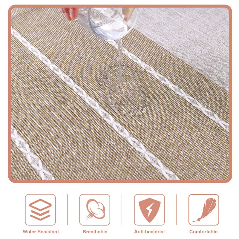 - 【WATERPROOF & EASY CARE】Waterproof coating adds a function of waterproof table cover; Machine washable in cold water, even feels more soft after first time wash; Tumble dry (low temprature suggested) or just hang it to dry; Ironing is entirely optional. Please notice it's not an oilcloth tablecloth.