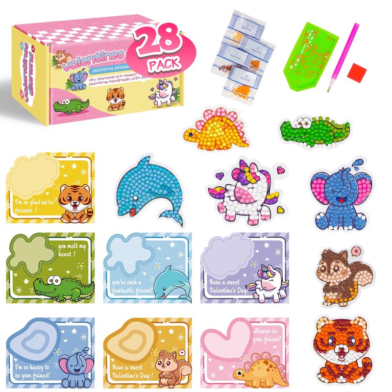 - This Valentines Day Cards for kids school comes with 28 Pack(7 animals, each 4 packs) buddies painting arts and crafts kits.Includes 7 Each of the Following Animals:Elephants,Unicorn,Crocodiles,Dolphins,Dinosaurs,Tiger,Squirrel,all in one meet your favor.Thoughtful and memorable gift.