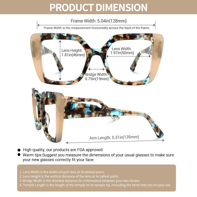 - ❤ Dimension -- Lens Width: 1.97" (50mm) , Lens Height:1.81 " (46mm) , Bridge Width:0.75" (19mm) , Frame Width:5.04" (128mm) , Arm Length: 5.31" (135mm)