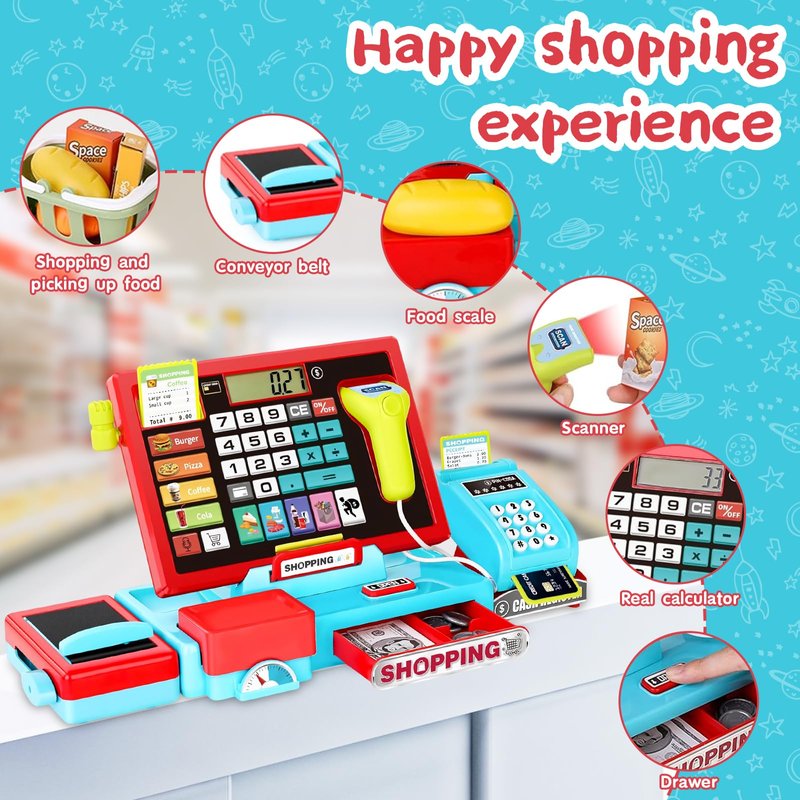 - Multifunctional Calculator Play set : Cash Register toy with a calculator, microphone, conveyor, play money, credit card, shopping basket, and food toy set. Promotes imaginative and active play, Kids can enjoy a fun pretend trip to the supermarket.