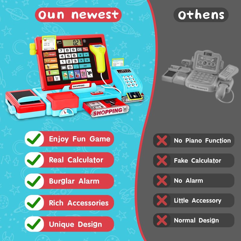- Cash register toy with calculator : The cash register toy features a functional calculator, allowing kids to learn basic math, practice money counting skills, and enhance their communication abilities!