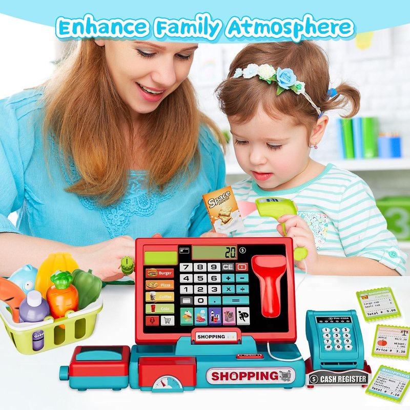 - Cash Register Playset with Piano Keys and Music: This pretend playset has multiple modes for fun, including piano music and realistic shopping sound effects. When toddlers scan toy foods and press buttons, it emits cool lights and "bi" sound effects.
