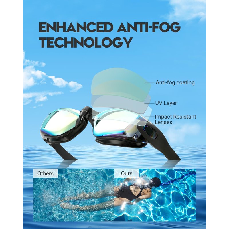 - Color Coating & Clear Vision: The fogging-preventive coating on the lenses provides crystal clear underwater vision. Advanced technology can enhance your swimming experience, making you enjoy a softer light version under the water.