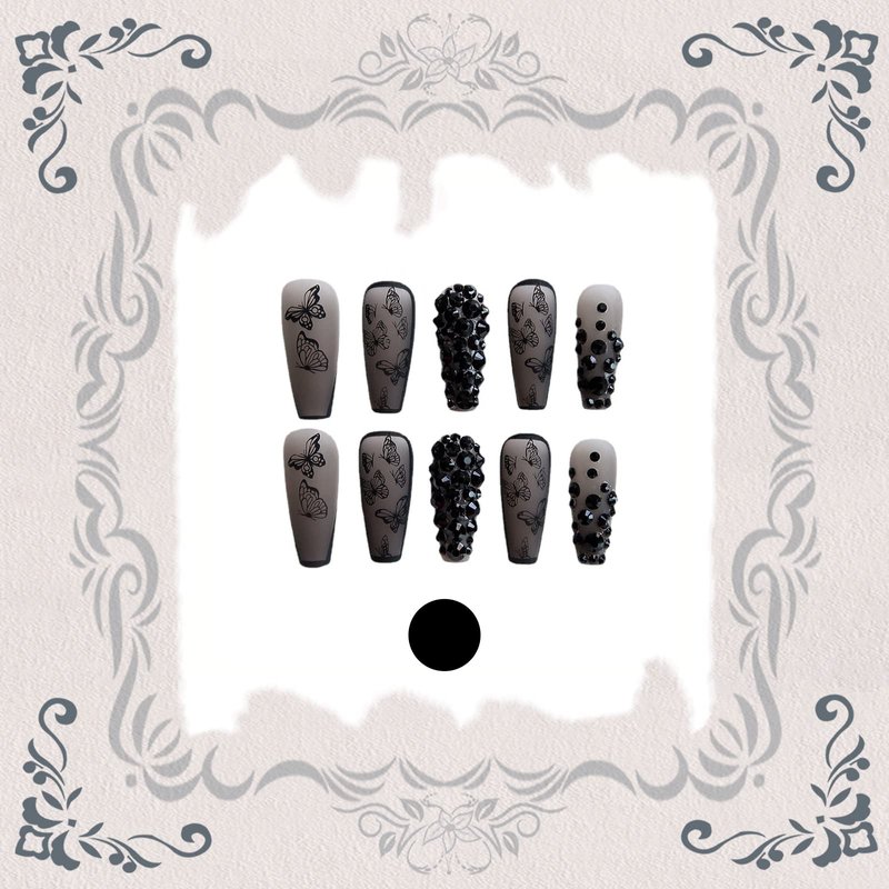 VOTACOS Press on Nails Long Coffin Fake Nails Black False Nails with 3D Rhinestone Butterfly Design Matte Full Cover Stick on Nails for Women