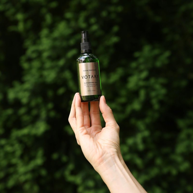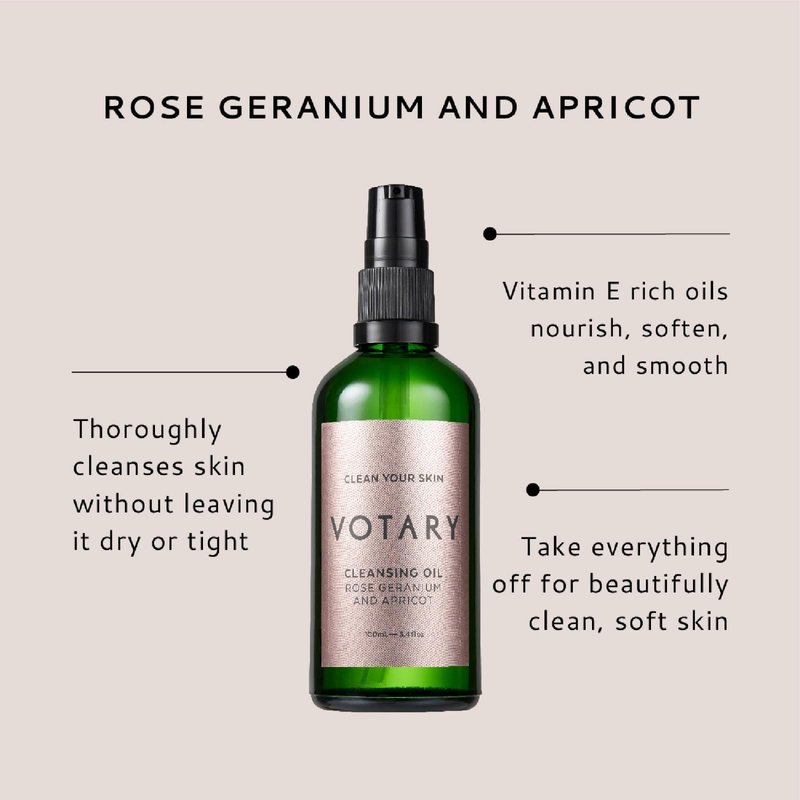 - Immerse yourself in the luxury of Votary's Cleansing Oil, an exquisite blend of Rose Geranium & Apricot. This botanical infusion not only allows for effective cleansing but also adds a touch of elegance to your skincare routine. Experience the beauty of nature with every use. Put 2 to 3 pumps of oil of cleansing oil into the palm of your hand. Spread between your palms & then apply to your face. Start with your cheeks, then your nose, mouth and jawline and finally the area around your eyes.
