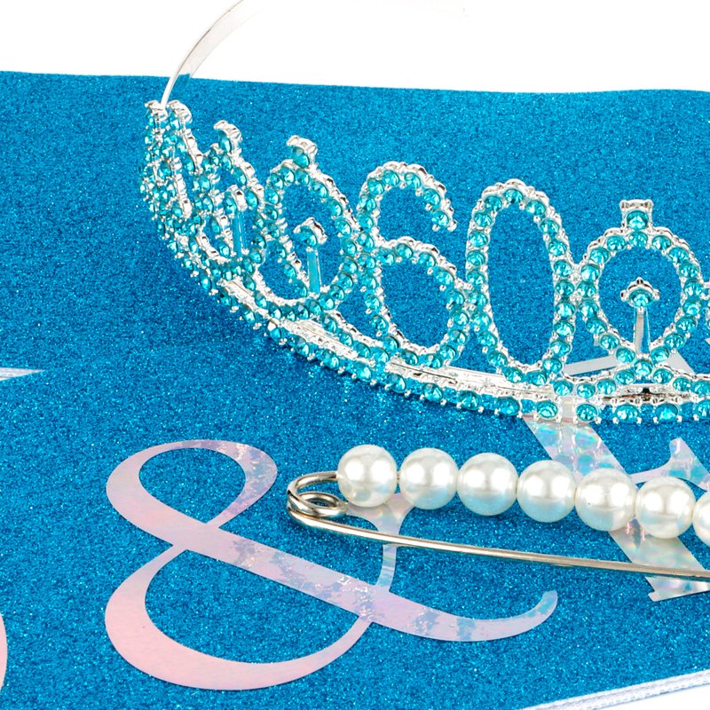 Product Description Birthday sash and tiara Set is great birthday gift for her! Wearing the sash the tiara to make the birthday protagonist special and stand out from the crowd. BIRTHDAY sash color: blue size: Approximately 62INCH long Rhinestones Tiara material: Alloy technique: hand made size: Fit girls and adult head sizes. Pearl pin: Can help adjust the length of the sash Happy Birthday : Glitter Happy birthday is good decoration to your birthday party. Package: The kit comes in a small box package.