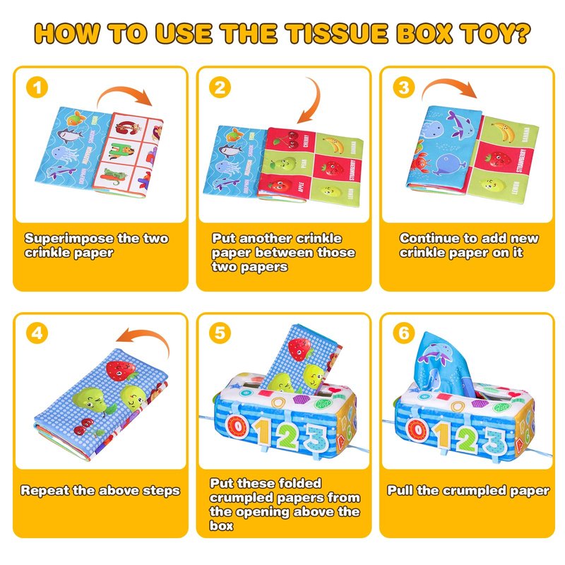 - Safe Material for Babies: Baby tissue box is skin-friendly, odorless, and soft to touch which made of non-toxic prime quality material, this montessori toys for babies 6-12 months is absolutely safe and very easy to use. Easy to carry and wash, it will not fade, enjoy the happy time of playing tissue box with your children