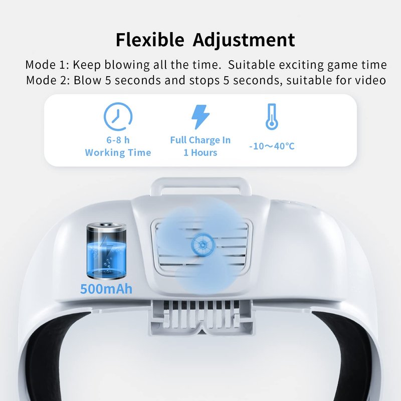 - KEEP LENS CLEAR ALL THE TIME: The facial cover with mini fan, support two modes setting, one is keep flowing all the time,can sucks enough air to prevent fogging during the most intense game play. Second mode is working 5 seconds, stops for 5 seconds, suitable for watching moive.