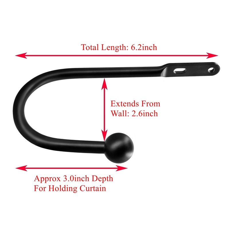 - 【Size】: Please beware the size of this curtain tieback hook is 6 inch in Length. The depth for holding the curtain is approx. 3 inches. It will not cover hold the whole curtains if the curtain is thick. (Check review pictures could see how it looks like after install). Also the Extends is 2.6" from wall and measures 6" wide. Please make sure there is enough space for you to install the hook on wall. You can see the listing picture (pic. 2) for details. Thank you.