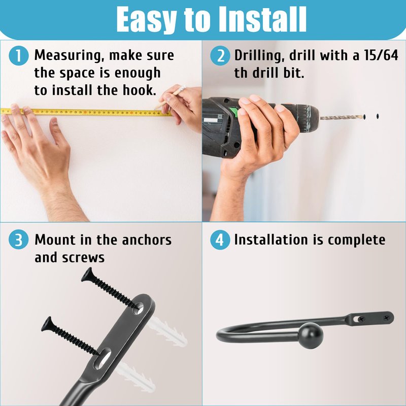 - 【Easy Installation】: The display could be horizontal or with angles, just make sure there have a 6-inch length space for the mounting. First drill holes with a 15/64th drill bit, punch the plastic anchor into the hole, hold the tieback close to the hole and then screw the metal screw into the anchor.