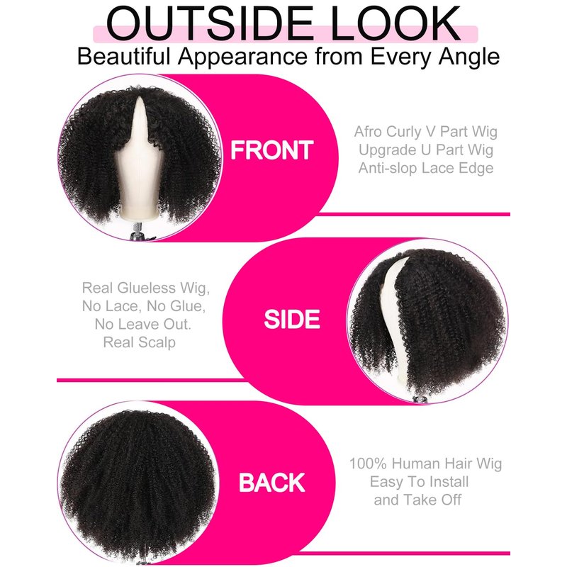 Vshow Glueless Wigs V Part Wig Human Hair Afro Curly Wig No Leave Out Thin Part Human Hair Wig Beginner Friendly 180% Density Upgrade U part Kinky Curly Wigs 20Inch
