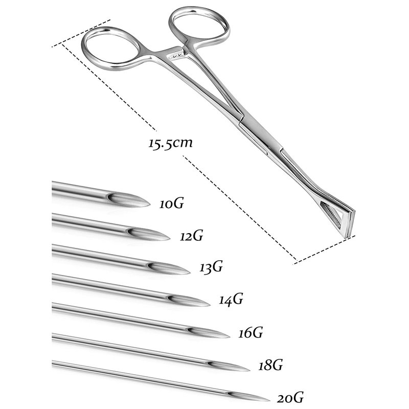 - [PRODUCT SIZE]: Forceps Piercing Clamps Piercing Tools: 155mm=6.1inch, Piercing Needles: 20G 18G 16G 14G 13G 12G 10G Each Size 2pcs, Piercing Jewelry: 20G 16G 14G.