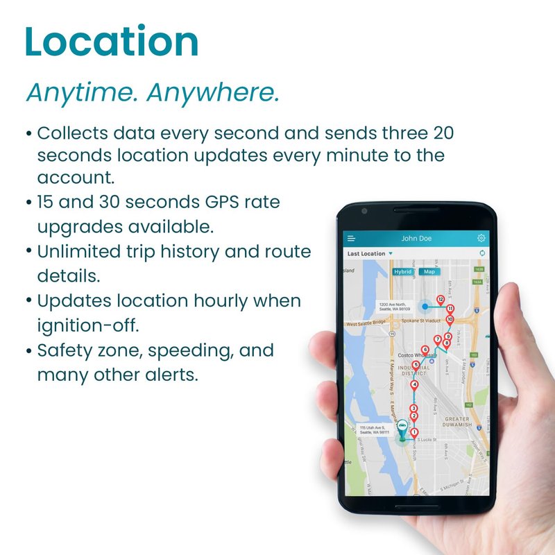 - Real Time Location Tracking and Trips. Collects data every second, analyzes, and sends 20 seconds update to the server every minute. Other upgrades available. Unlimited trip history on map. No battery needed. Draws very little power from OBD-II port. Goes to sleep while ignition-off saving battery power and wakes up once in every hour to update location. Shared accounts for car tracking device. Live customer support avalable 7 days a week.