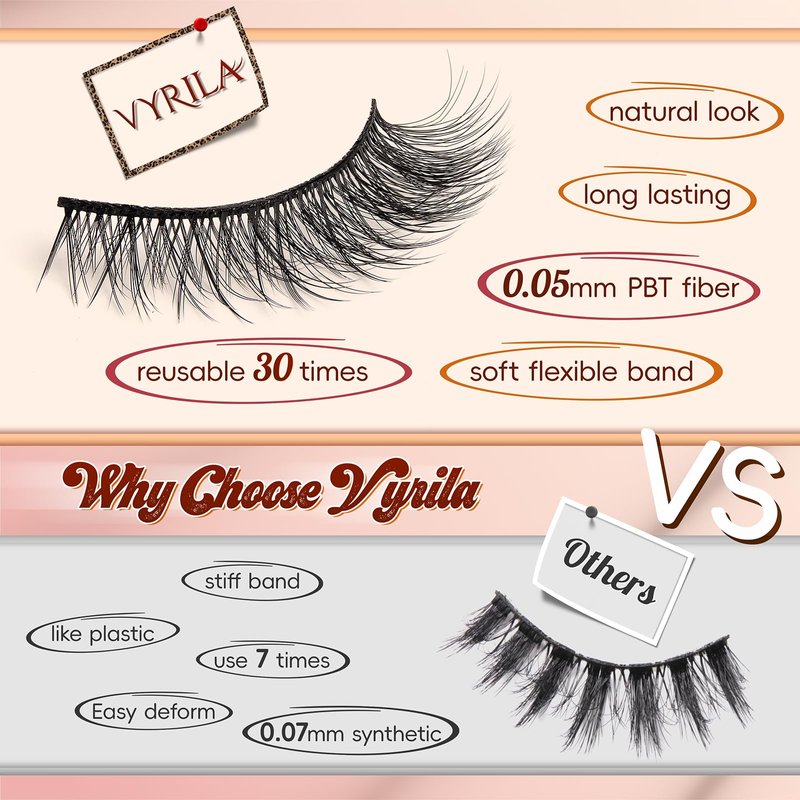 - 𝟎.𝟎𝟓𝐦𝐦 𝐏𝐁𝐓 𝐅𝐢𝐛𝐞𝐫 𝐖𝐢𝐬𝐩𝐲 𝐋𝐚𝐬𝐡𝐞𝐬:VYRILA's eyelashes are made of exclusive 0.05mm PBT fiber and exclusive technology. The tapered tip and feather fluffy achieve 0 burden. The natural matte black color makes the strip lashes look like natural eyelashes