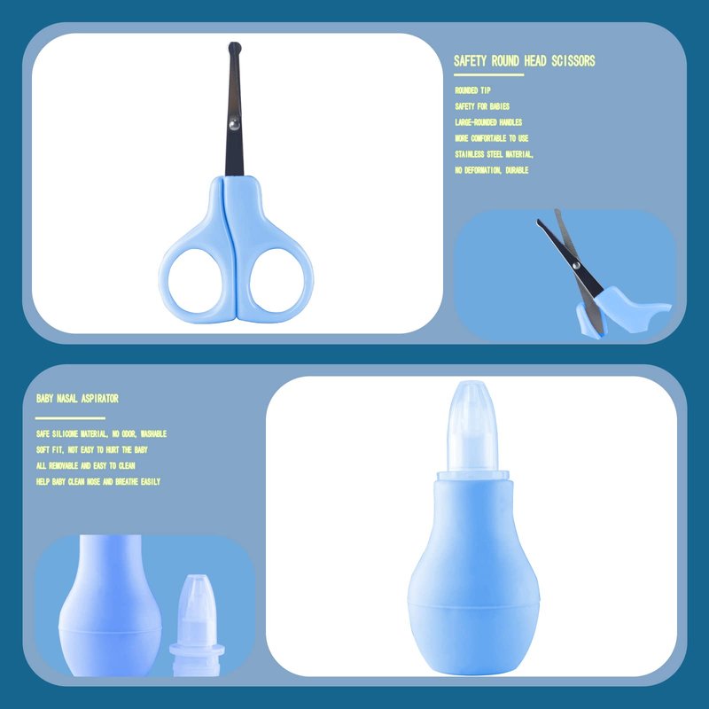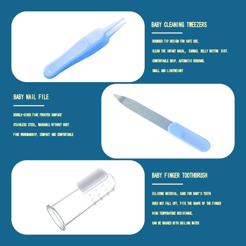 - Newborn Essentials(10 in 1):this is a great starter kit for a newborn into toddler years.includes baby ear wax removal tool , baby nail clippers, baby scissors, baby nail file, baby comb, baby brush, baby finger toothbrush, baby nose aspirator, baby tweezers.has everything you need for baby