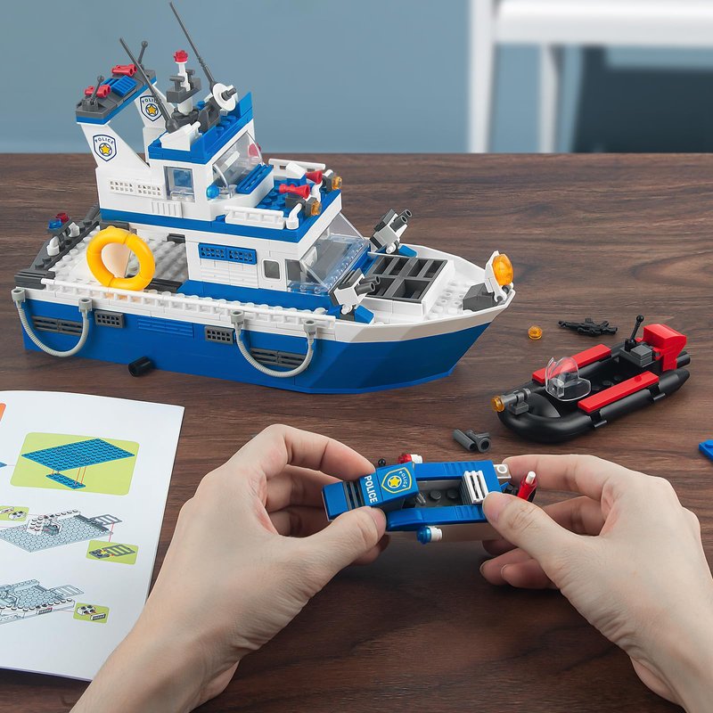 - Cool City Police Play Set: The marine police boat building sets consists of 480 pieces. Including patrol boat, speedboat dinghy and rescue ship. Catch criminals, keep the city safe, and provide city police fans with hours of thrilling police adventure fun.