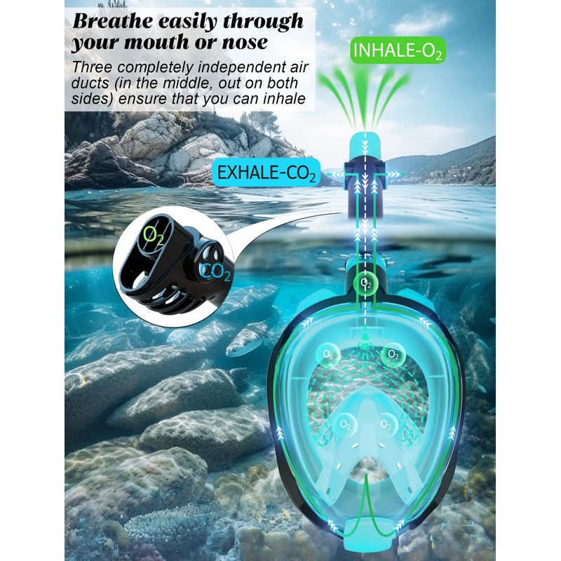 - MORE FREEDOM FOR SNORKELING:Traditional snorkeling equipment requires biting onto a breathing tube and only allows breathing through the mouth. With a full face snorkel mask, you don't need to bite onto anything and can breathe through your nose or mouth, making snorkeling more liberating. Two separate air channels ensure the steady delivery of fresh air to the mask, facilitating smoother breathing. There is also a dedicated exhale channel to quickly eliminate CO2 and prevent fogging.