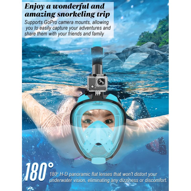- CLEARER VISION:The window of the full face snorkel mask is designed with a flat surface, eliminating the distortion of underwater vision that can cause dizziness and discomfort. With a 180 degree wide angle view, you can enjoy a clear underwater perspective and better appreciate the beauty of the ocean. Equipped with a sports camera mount, you can capture the wonders of the marine world and share them with your friends and family.