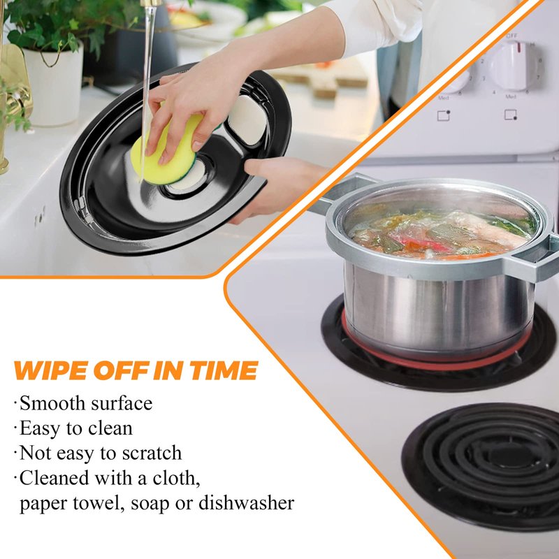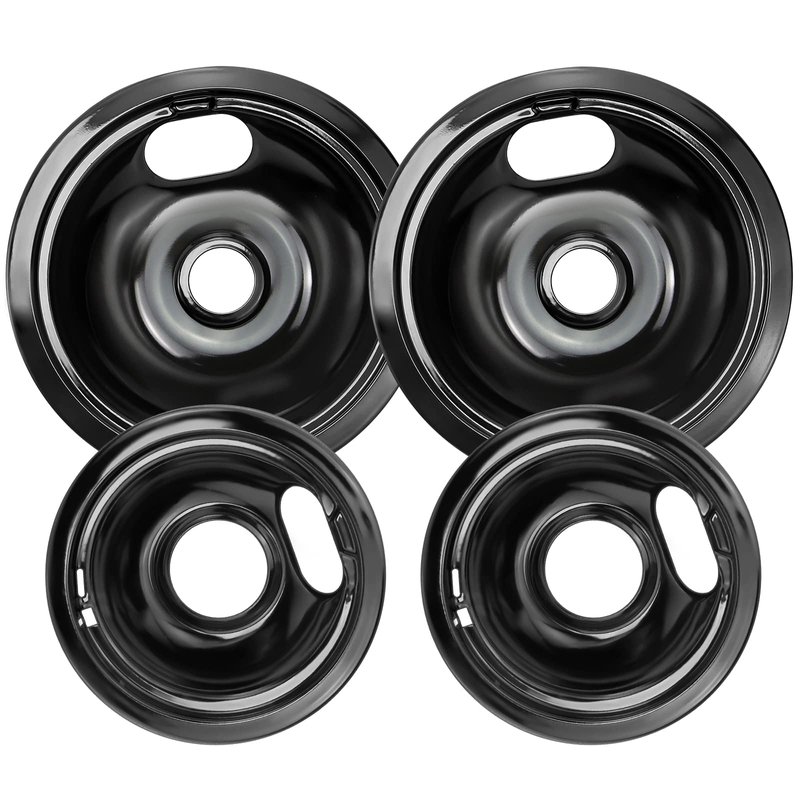 - √√ 【6" & 8" Burner Drip Pans】: You will receive: 2 x 6-inch W10290353 black stove drip pans and 2 x 8-inch W10290350 porcelain drip pans, 4 pcs black burner drip pans in the package. W10290350 W10290353 porcelain burner drip pan bowls are made of high-quality chrome-plated material for maximum longevity. 6-Inch Pans are 7.5 inches in diameter and 8-Inch Pans are 9.2 inches in diameter. Black burner drip pans. The electric stove burner drip pans are easy to clean and can be cleaned with a cloth, paper towel, soap or dishwasher.