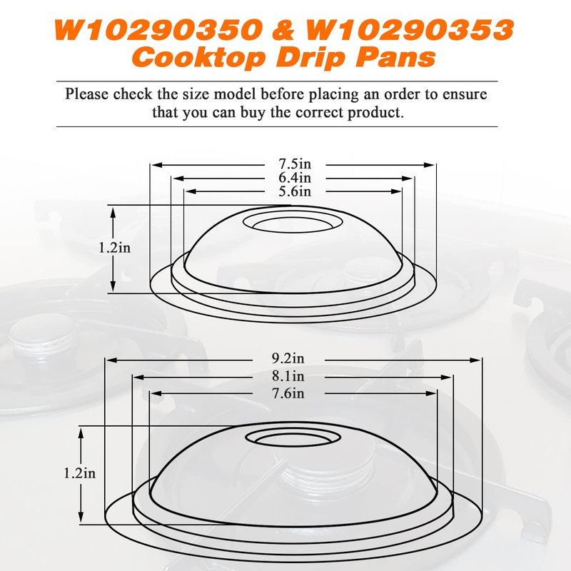 - Style: W10290350 W10290353 electric stove burner drip pans - Includes 2 Pack 8-Inch and 2 Pack 6-Inch Pans