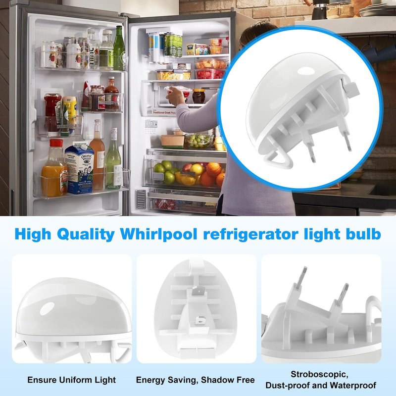 - 【High Quality】Whirlpool refrigerator light bulb composed of high quality materials,ensure uniform light, energy saving, shadow free, stroboscopic, dust-proof and waterproof.Easy installation, perfect fit.