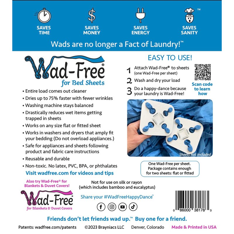 WAD-FREE WAD PREVENTER - Washer and Dryer Bed Sheet Detangler reduces the tangling, twisting, and balling-up of bed sheets in both the washing machine and the dryer. Saves time, money, energy…and sanity! Wad-Free for Bed Sheets was inside the GOOD HOUSEKEEPING Cleaning Lab and called Genius Sheet Detangler: We’ve washed and dried our share of sheets in the GH Cleaning Lab, and Wad-Free impressed us. It was easy to attach and remove, stayed secured in the washer and dryer and was able to keep even king-size sheets from tangling, helping to reduce wrinkles and speed up drying. Quick and Easy to Use, Reusable, Non-toxic. No latex, PVC, BPA, or phthalates. Genuine Wad-Free is Patented and Made in the USA. Each package contains enough for 2 sheets, flat or fitted: if you wash one set of sheets, you need 1 package. For two sets of sheets, you need 2 packages, etc. Safe for appliances and sheets following fabric care instructions. Bonus Uses: Wad-Free for Bed Sheets is also useful for tablecloths, pre-washing fabric yardage for sewing, keeping socks paired in the wash, and stopping apron strings from tangling. Wad-Free is not for use with fabric containing rayon (including rayon from bamboo and eucalyptus). Rayon goes by many names, including viscose, modal, lyocell, acetate, cuprammonium, nitro silk. Please visit the TROUBLESHOOTING section and watch the Troubleshooting video if you have trouble getting Wad-Free to work for you.
