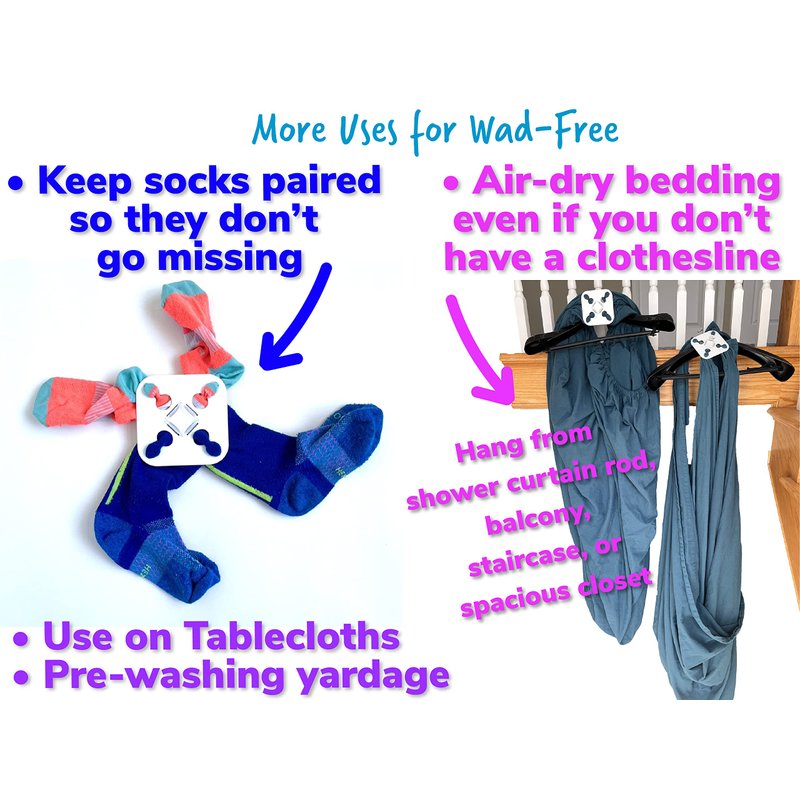 - Also suitable for tablecloths, pre-washing fabric yardage for sewing or crafting, pairing socks so they don't get lost, and reducing the tangling of apron strings. Wad-Free also aids air-drying bedding, even if you don't have a clothesline: just wash with Wad-Free for cleaner sheets, then hang from the base indoors. Wad-Free for Bed Sheets is intended for the size, weight, and thickness of a bed sheet; we also have a heavy-duty version available called Wad-Free for Blankets & Duvet Covers which is intended for those items.