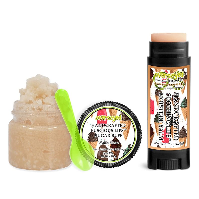Waffle Cone Soothing & Luscious Lips by OverSoyed Exfoliator & Chapped Lip Repair Lip Care Combo | Artisan Handcrafted to Order Crispy Waffle Buttercream Cinnamon Burnt Caramel Flavored Exfoliating Sugar Lip Scrub & Lip Moisturizer Balm Gift Set
