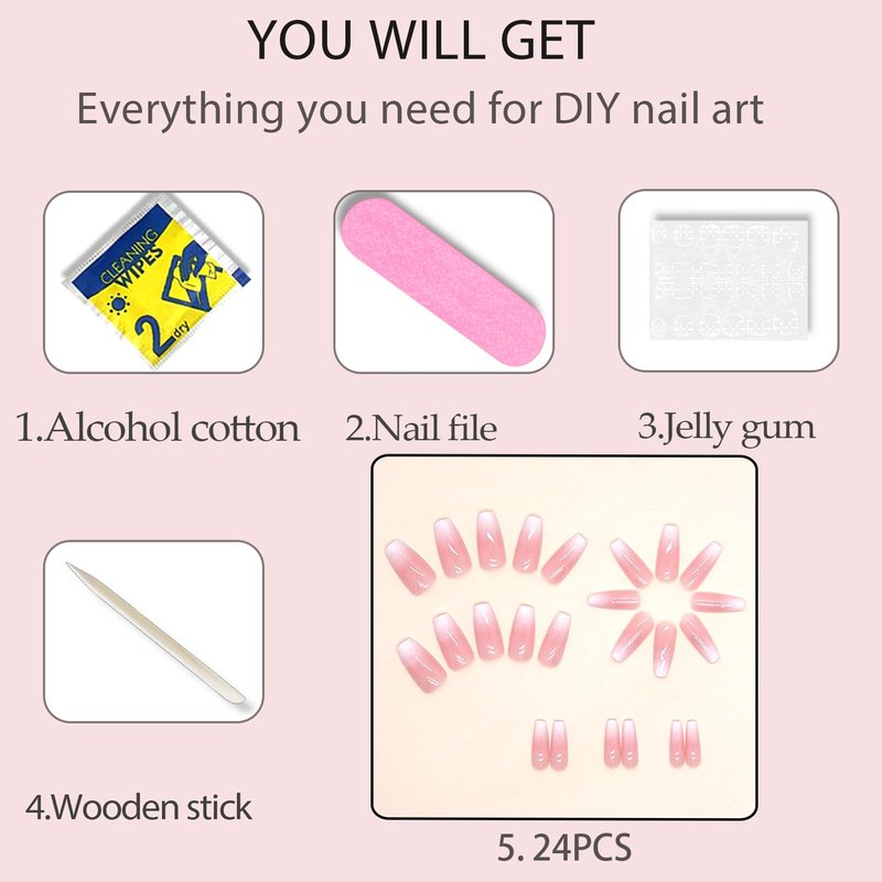 - 【Press on Nails Coffin Package】- 24pcs/12 sizes coffin nails,1 nail file,stick 1, wipes 1, jelly glue 24。( You can choose the best fake nails for you, which are easy to trim and file into any length and shape you like.)