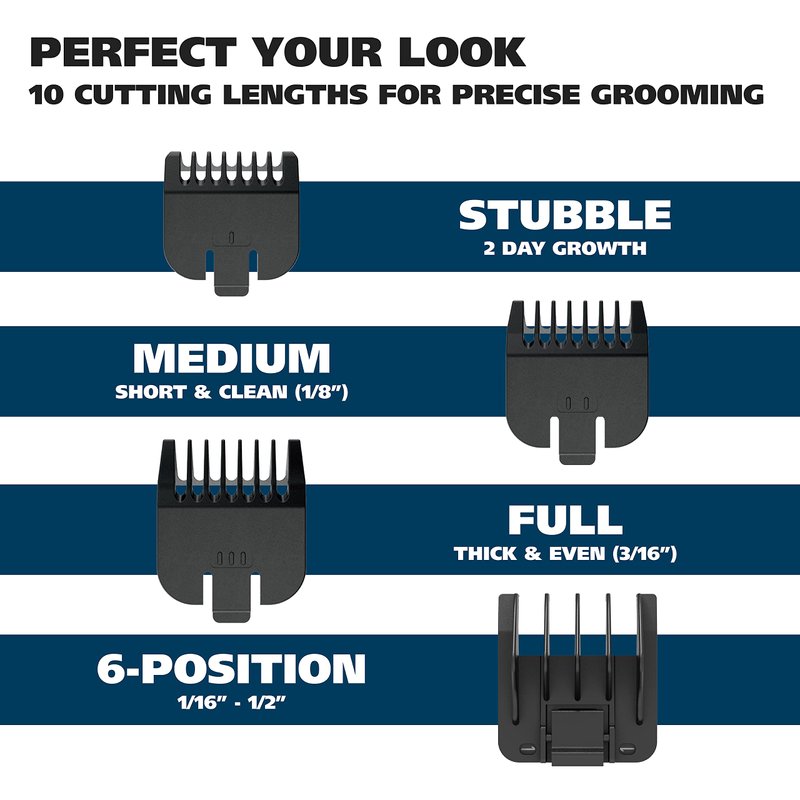 - Stainless Steel Blades – Our high-carbon precision-ground blades stay sharp longer, use in conjunction with our six-position beard regulator for multiple face trimming lengths; our beard guards vary from stubble to short & clean, to thick & even