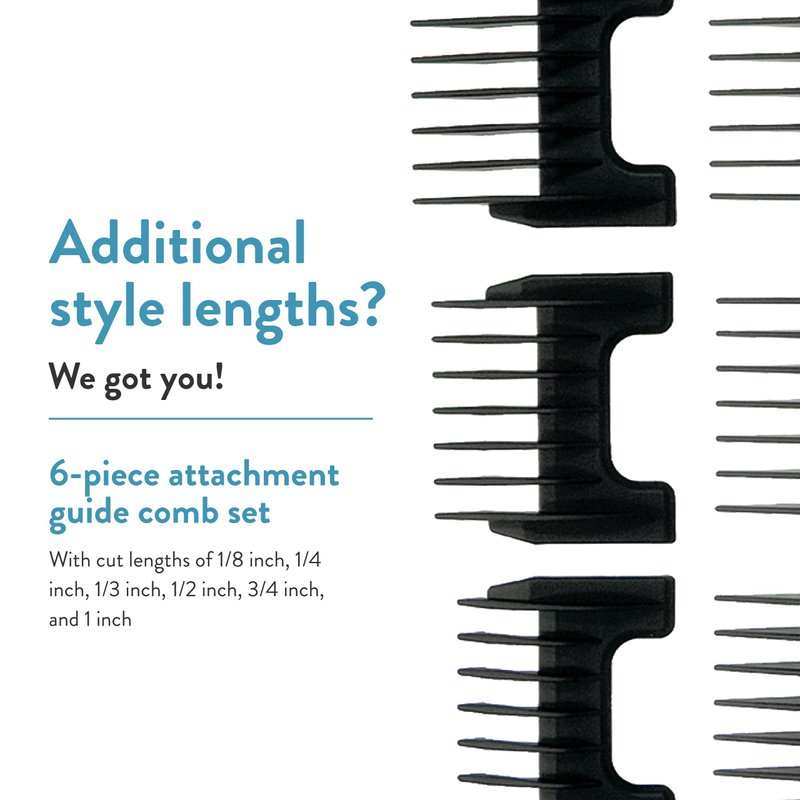 - This item includes 6 plastic attachment guide combs: 1/8-inch,1/4 -inch, 1/3-inch, 1/2-inch, 3/4-inch, and 1-inch cut lengths