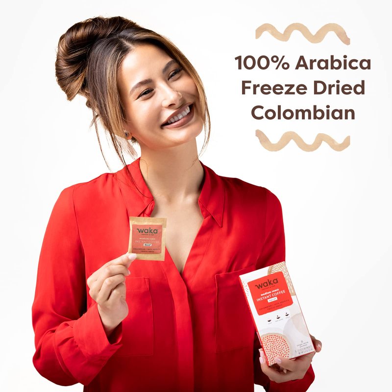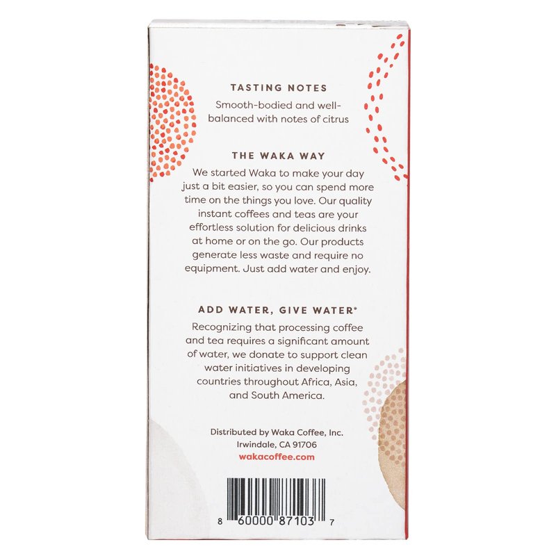 Elevate your coffee moments with Waka Decaf Colombian Instant Coffee Single Serve. Crafted from 100% Arabica beans, this medium roast offers a smooth body and zesty citrus notes. Our innovative freeze-drying captures the full flavor, while the unique EA method gently removes caffeine using natural acetic acid and Colombian sugarcane-derived ethyl alcohol, washed with pure spring water. No sugar added. Just add water and enjoy the convenience of single-serve bliss – 8 packets for 8-10 fl oz cups. Embrace sustainability with recycled packaging. Indulge in quality, eco-friendly coffee anywhere your journey leads.