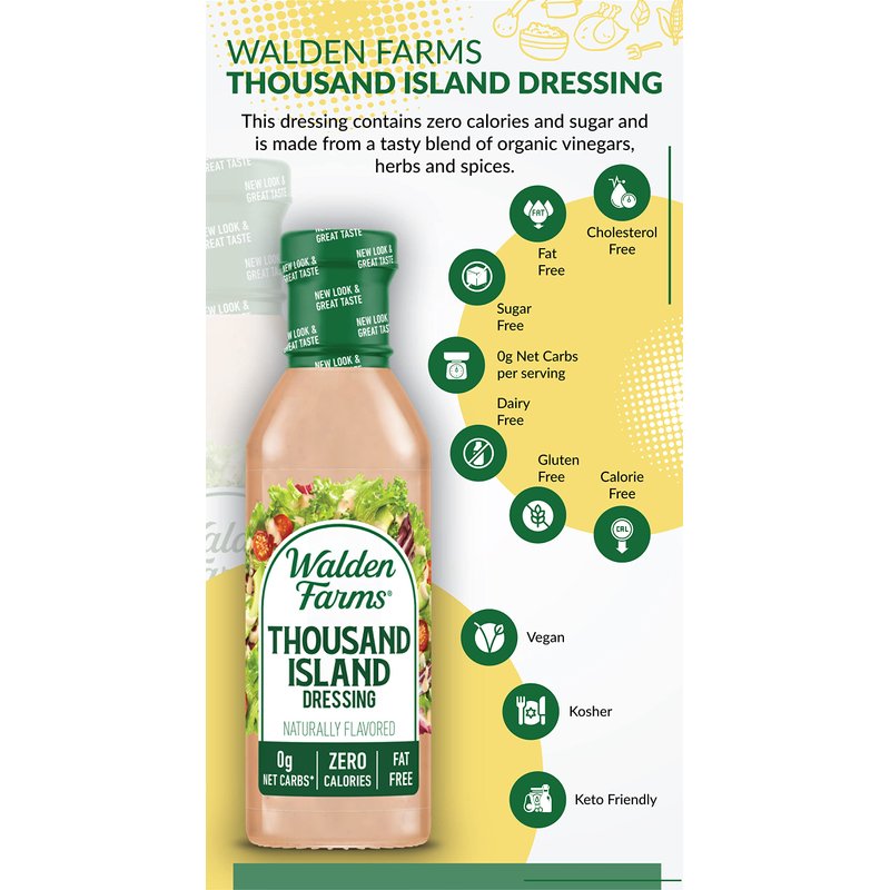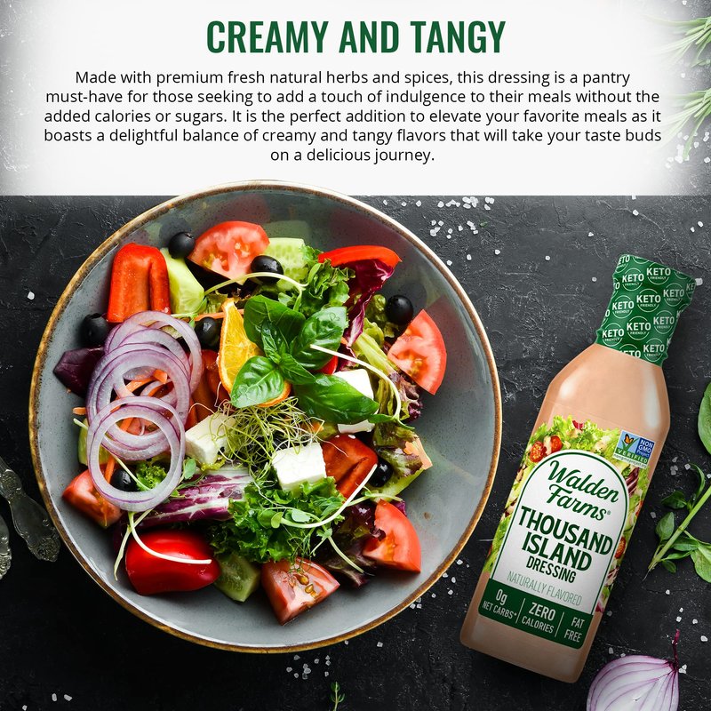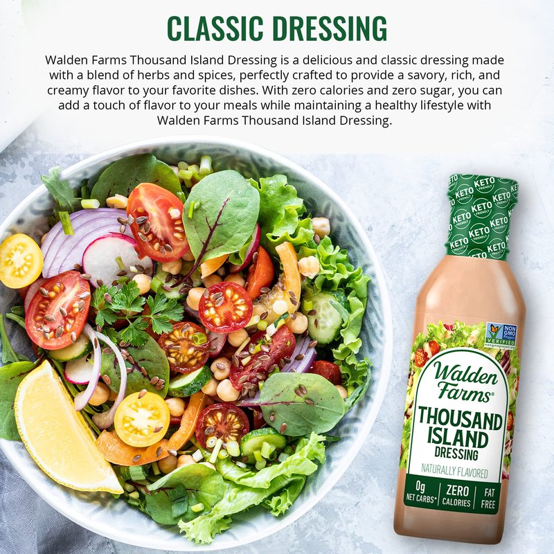 - CLASSIC DRESSING - Walden Farms Thousand Island Dressing is a delicious and classic dressing made with a blend of herbs and spices, perfectly crafted to provide a savory, rich, and creamy flavor to your favorite dishes. With zero calories and zero sugar, you can add a touch of flavor to your meals while maintaining a healthy lifestyle with Walden Farms Thousand Island Dressing.